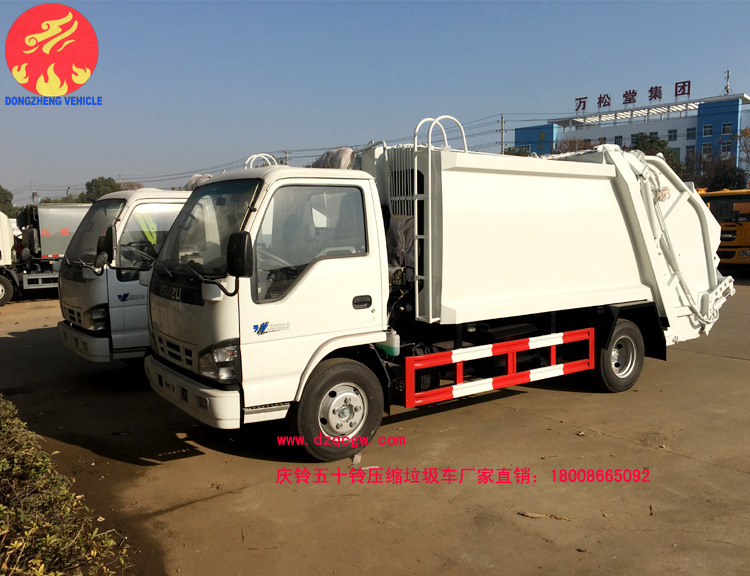 慶鈴五十鈴國五壓縮式垃圾車,采用慶鈴600P輕卡底盤,慶鈴130馬力發動機,尼龍胎,ABS。廂體材料為武鋼優質炭鋼,厚度為邊5mm,廂體容積為5-6立方米。由裝料機構、壓縮機構、卸料機構、油泵、油箱、控制閥等組成的液壓機構組成。裝料機構由支架、連桿機構、凸輪、掛鉤等組成,在油缸作用下,將垃圾桶內的垃圾自動翻轉倒入料斗內。主要用于收集與轉運生活垃圾。