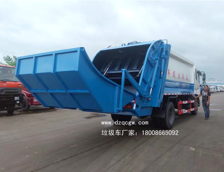 上裝說明: 廂體材料為武鋼優質炭鋼,厚度為邊5mm,廂體容積為12-13立方米。由裝料機構、壓縮機構、卸料機構、油泵、油箱、控制閥等組成的液壓機構組成。裝料機構由支架、連桿機構、凸輪、掛鉤等組成,在油缸作用下,將垃圾桶內的垃圾自動翻轉倒入料斗內。新款有9支液壓缸制動,不帶副壓板,液壓控制操作系統為電動控制和手動控制。